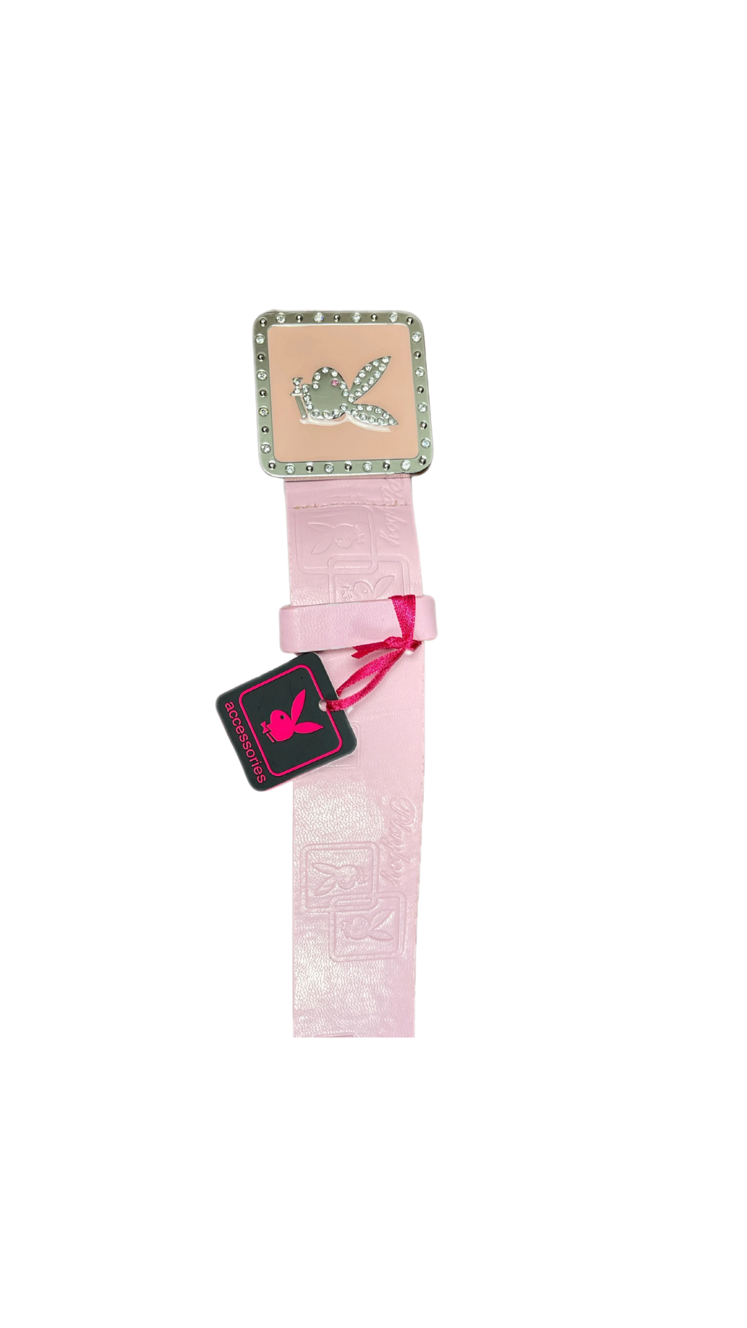 No early-2000s wardrobe was complete without a bold statement belt — and this one is pure bling-bling perfection. The Pink Bunny Belt pairs bubblegum pink faux leather with an oversized pastel buckle, featuring the iconic Playboy bunny in sparkling rhinestones framed by metallic studs.